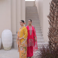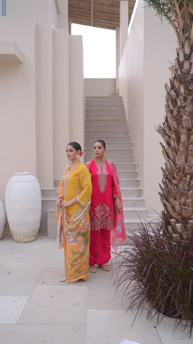 Bring sunshine to your wardrobe with this yellow embroidered suti set crafted from soft and breathable mal chandri fabric. The calf-length kurta features intricate embroidery with a flattering V-neckline and 3/4th sleeves, giving it a refined festive appeal. Paired with straight pants for all-day comfort and a stylish cotton printed dupatta, this set is a perfect blend of elegance and ease. Ideal for festive celebrations, family gatherings, and cultural occasions.