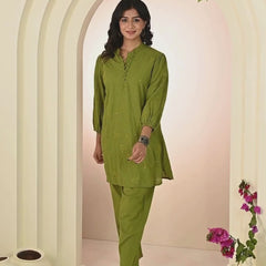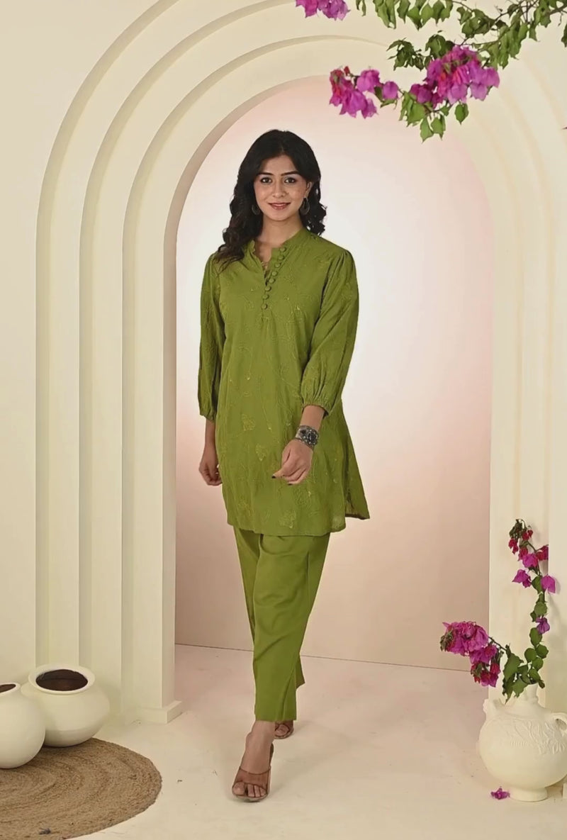 Step into a world of effortless grace with our Green Embroidery Co-ord Set, where timeless elegance meets contemporary charm. The refreshing green hue is beautifully complemented by delicate embroidery, creating a look that's both vibrant and refined. Designed with a flawless fit and crafted from soft, breathable fabric, this co-ord set promises all-day comfort without compromising on style. Perfect for festive gatherings, brunch dates, or any occasion that calls for understated glamour, this ensemble is your go-to choice for making a chic impression. Pair it with statement accessories and let your style shine effortlessly!